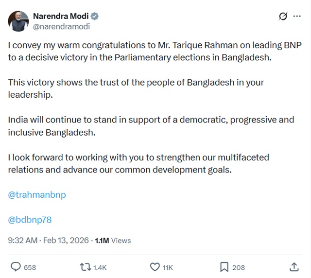 ত্রয়োদশ জাতীয় সংসদ নির্বাচনে নিরঙ্কুশ বিজয়ে বিএনপির নেতৃত্ব দেওয়া দলটির চেয়ারম্যান তারেক রহমানকে উষ্ণ অভিনন্দন জানিয়েছেন ভারতের প্রধানমন্ত্রী নরেন্দ্র মোদি।
