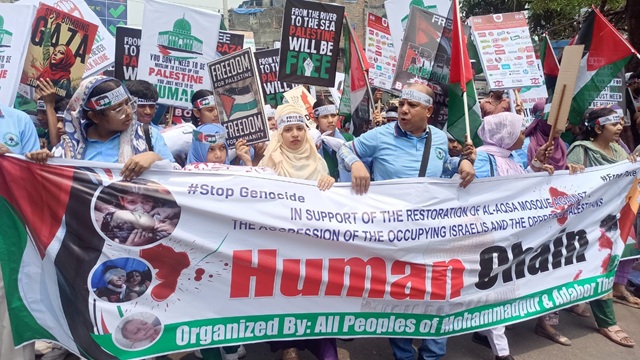অবরুদ্ধ ফিলিস্তিনের ভুখণ্ডে ইসরাইলের নারকীয় আগ্রাসনের বিরুদ্ধে মানববন্ধন করে ড্রীম-এনএলজে হাই স্কুলের ছাত্র-ছাত্রী, শিক্ষক-শিক্ষিকাসহ স্থানীয় জনগণ।