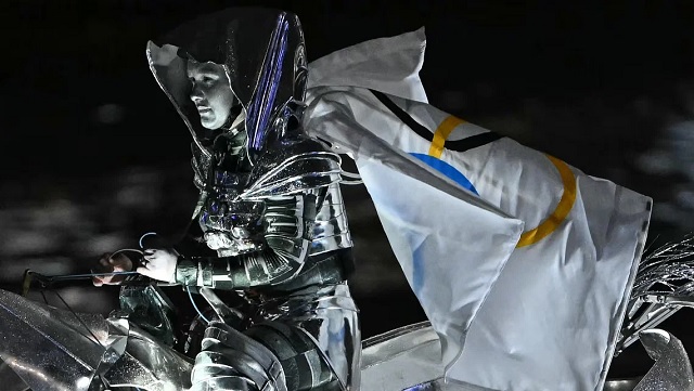 মার্চপাস্ট শেষে সিন নদীর বুকে ছুটল ধাতব ঘোড়া! তাতে নাইটদের মতো রুপালি পোশাকের একটি মেয়ে বসে। রুপালি হুডিতে মুখটা ঢাকা। পিঠে তার অলিম্পিকের পতাকা। প্রযুক্তির সাহায্যে ধাতব ঘোড়া সিনের বুক পাড়ি দিয়েছে। নদী পাড়ি দিয়ে সাদা ঘোড়ায় চড়ে সরাসরি মঞ্চে গিয়ে পতাকা অর্পণ করেছে মেয়েটি। নিউইয়র্ক টাইমস জানিয়েছে, ফ্রান্সের মুক্তিকামী বীরকন্যা জোয়ান অব আর্কের সাজ দেওয়া হয়েছে তাকে।